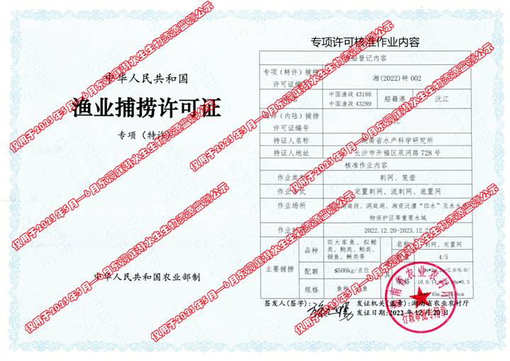 附件1:专项(特许)捕捞证—湘(2022)特002号