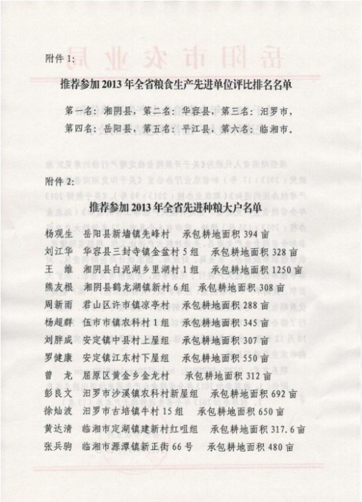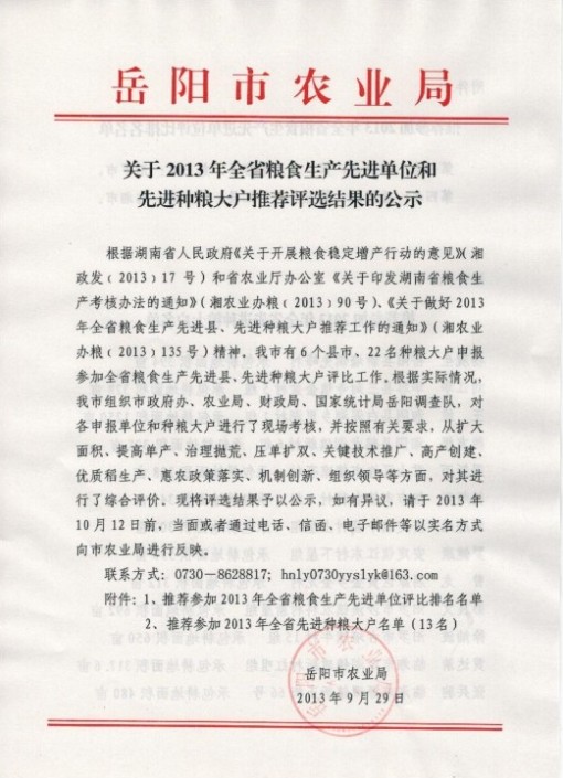 关于2013年全省粮食生产先进单位和先进种粮大户推荐评选结果的公示