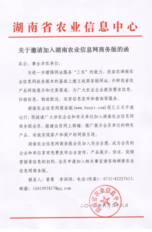 关于邀请加入湖南农业信息网商务版的函