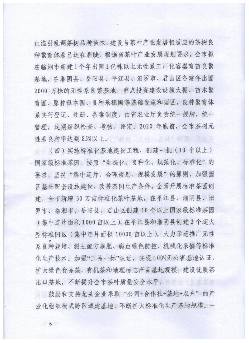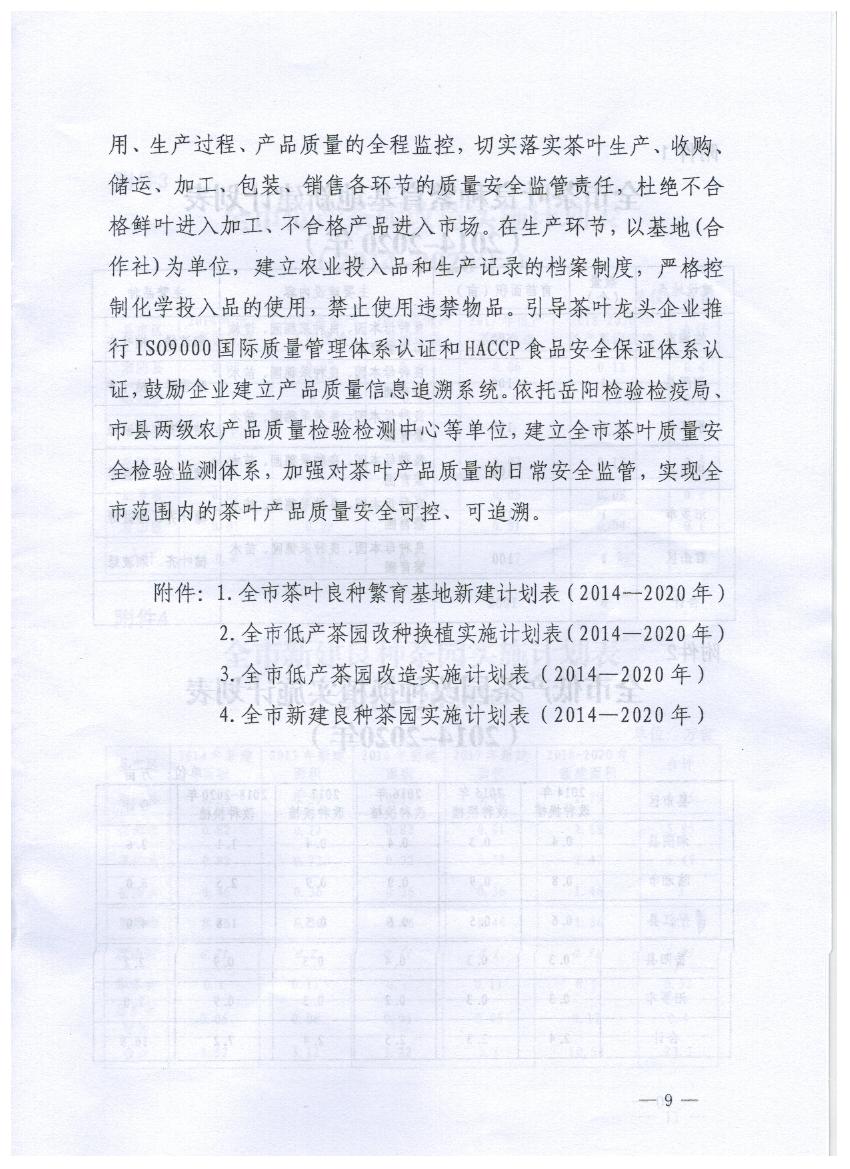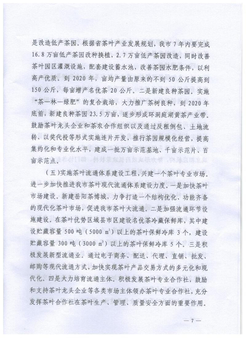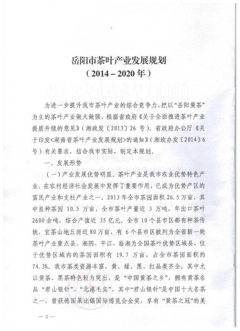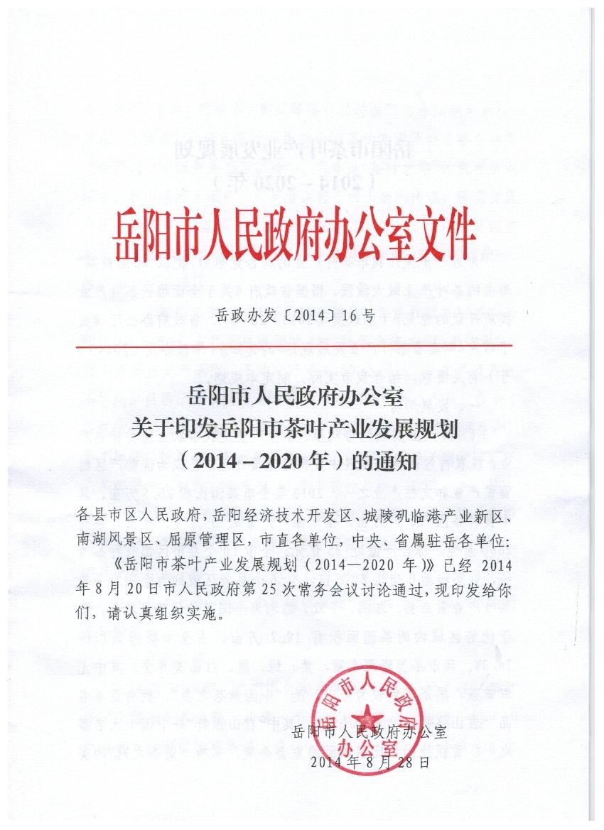 岳阳市人民政府办公室关于印发岳阳市茶叶产业发展规划(2014-2020年)的通知