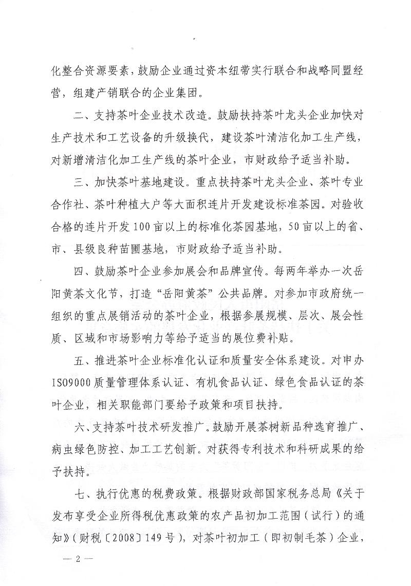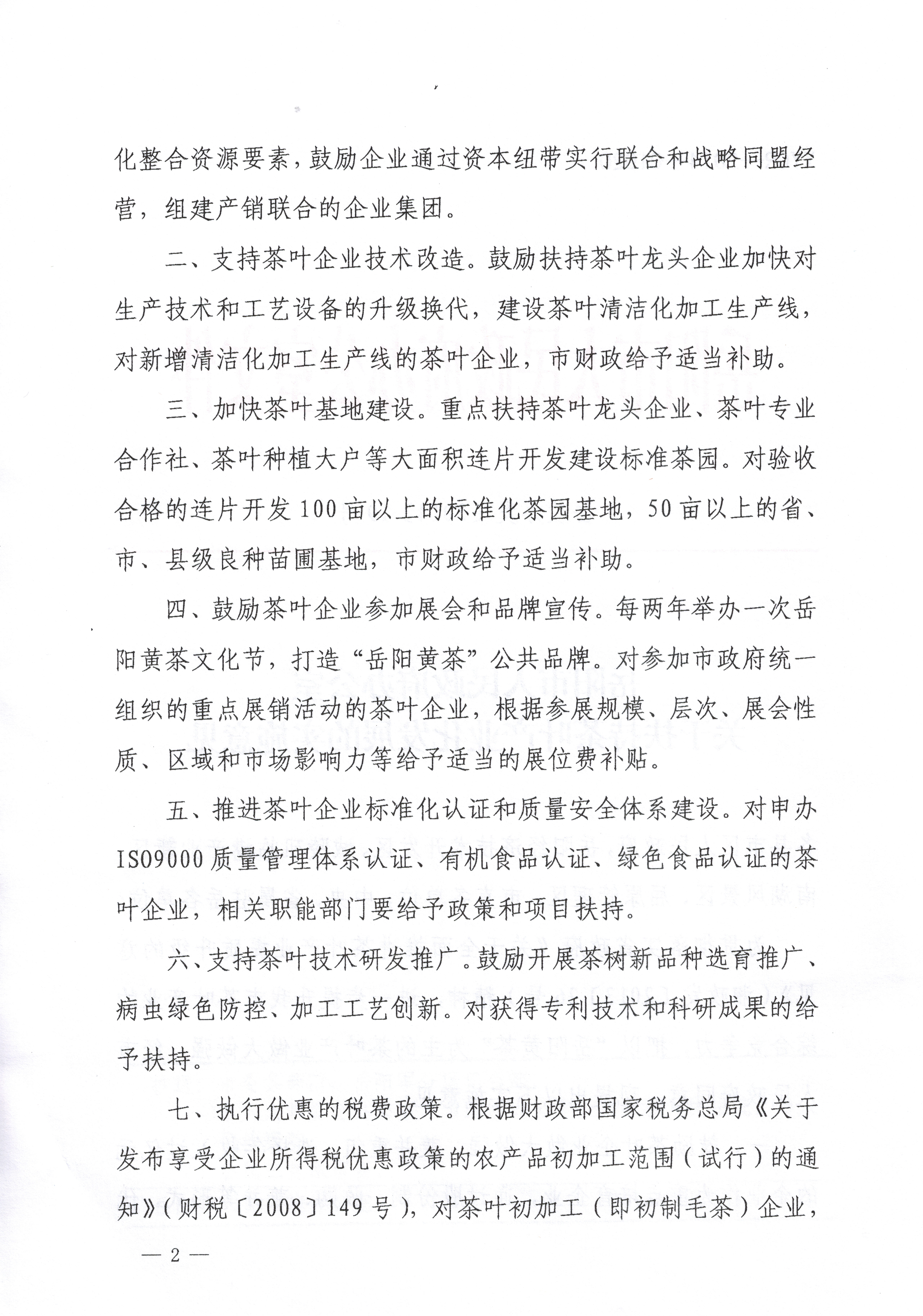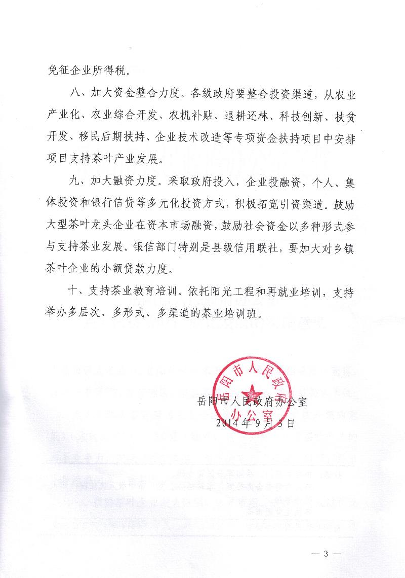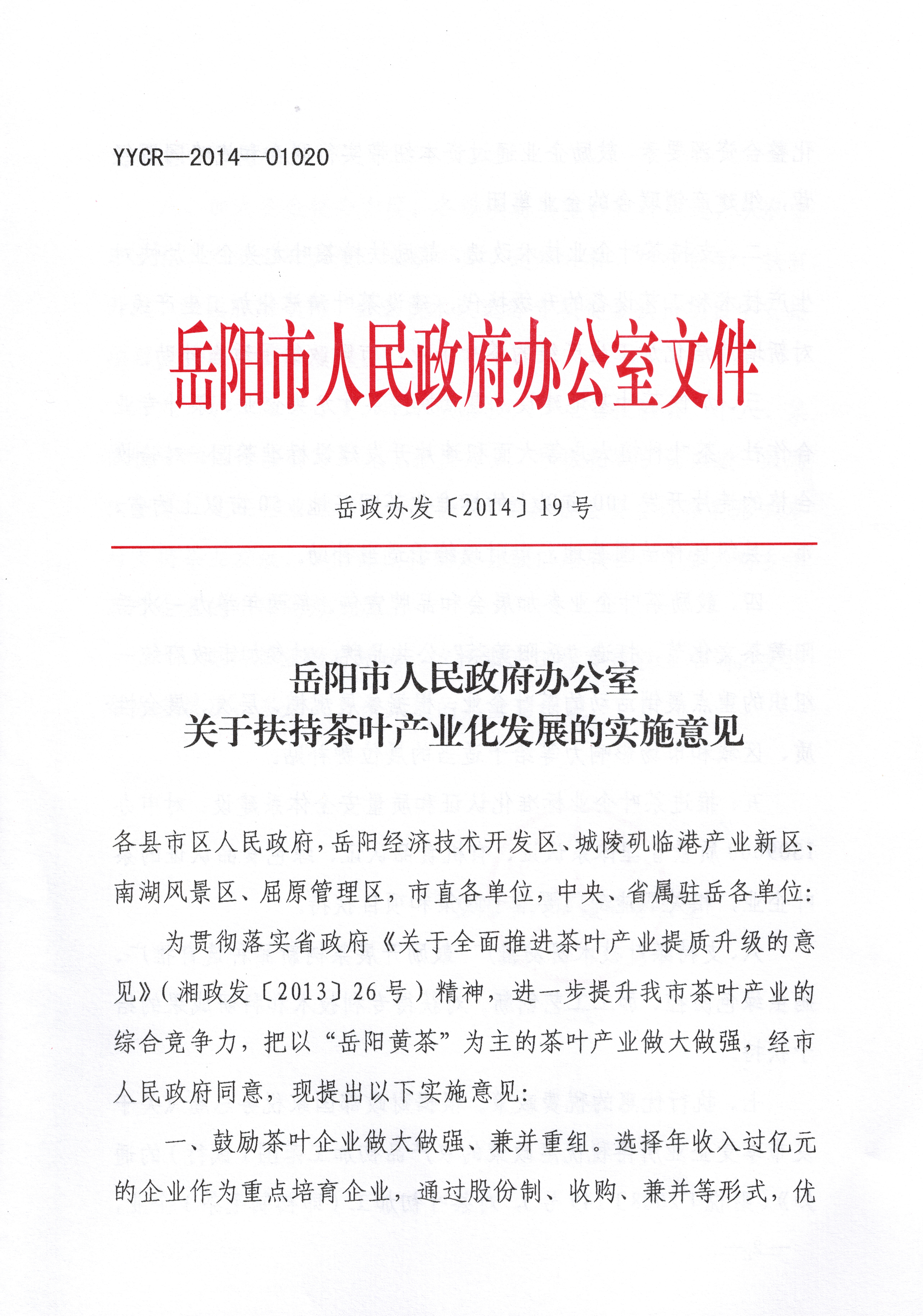 岳阳市人民政府办公室关于扶持茶叶产业化发展的实施意见